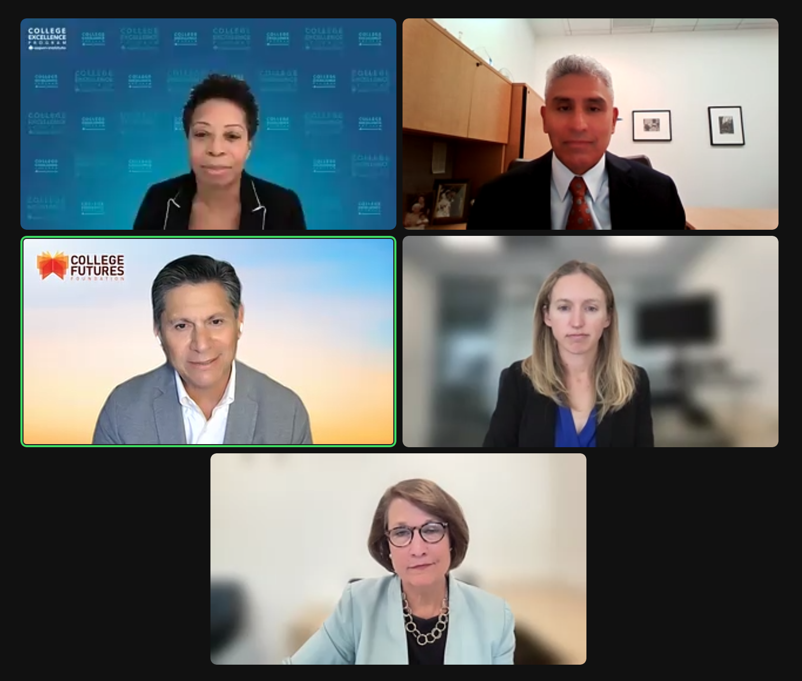 Chancellor Juan Salgado, upper right corner, discusses the Strada Education Foundation report findings on a virtual panel.