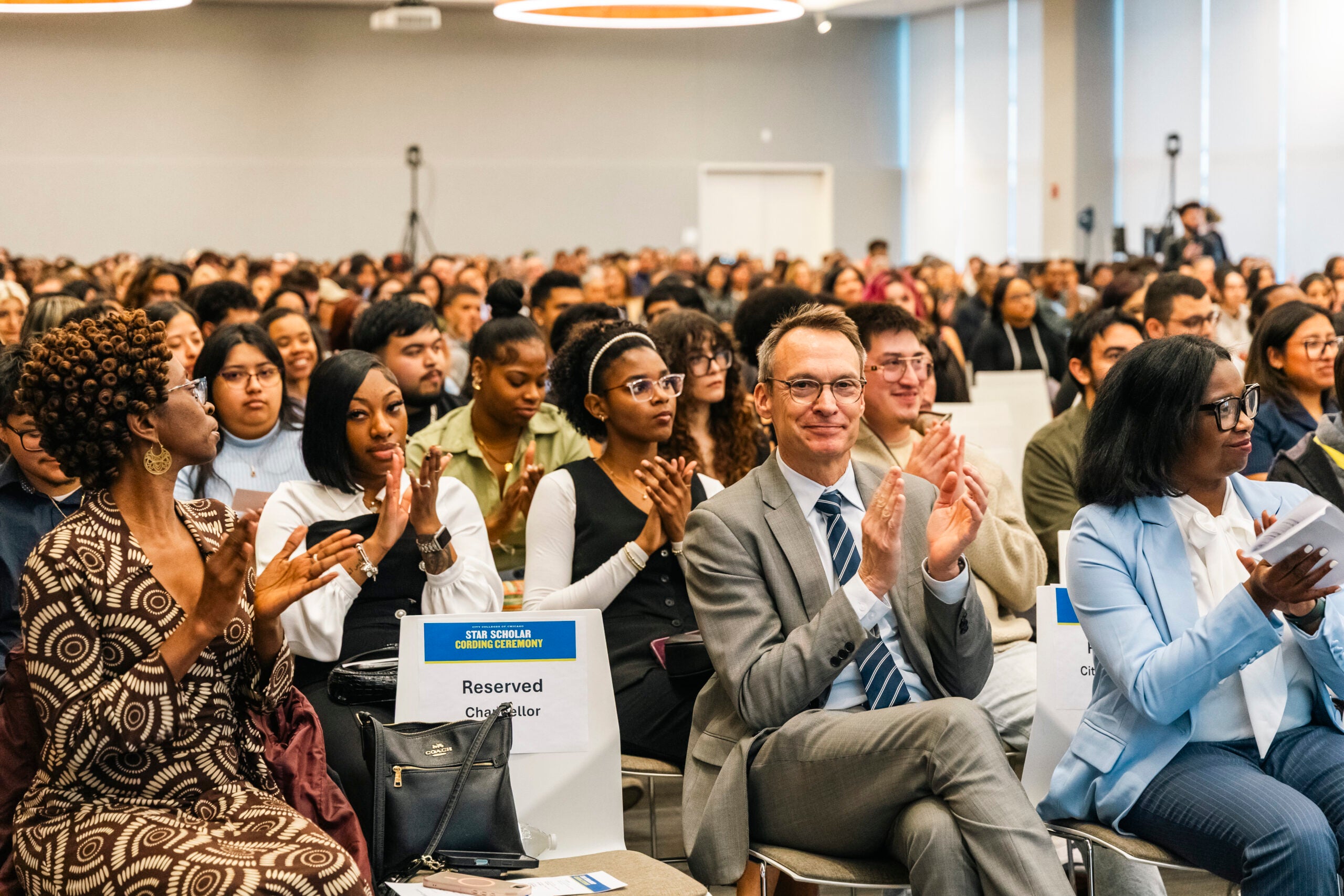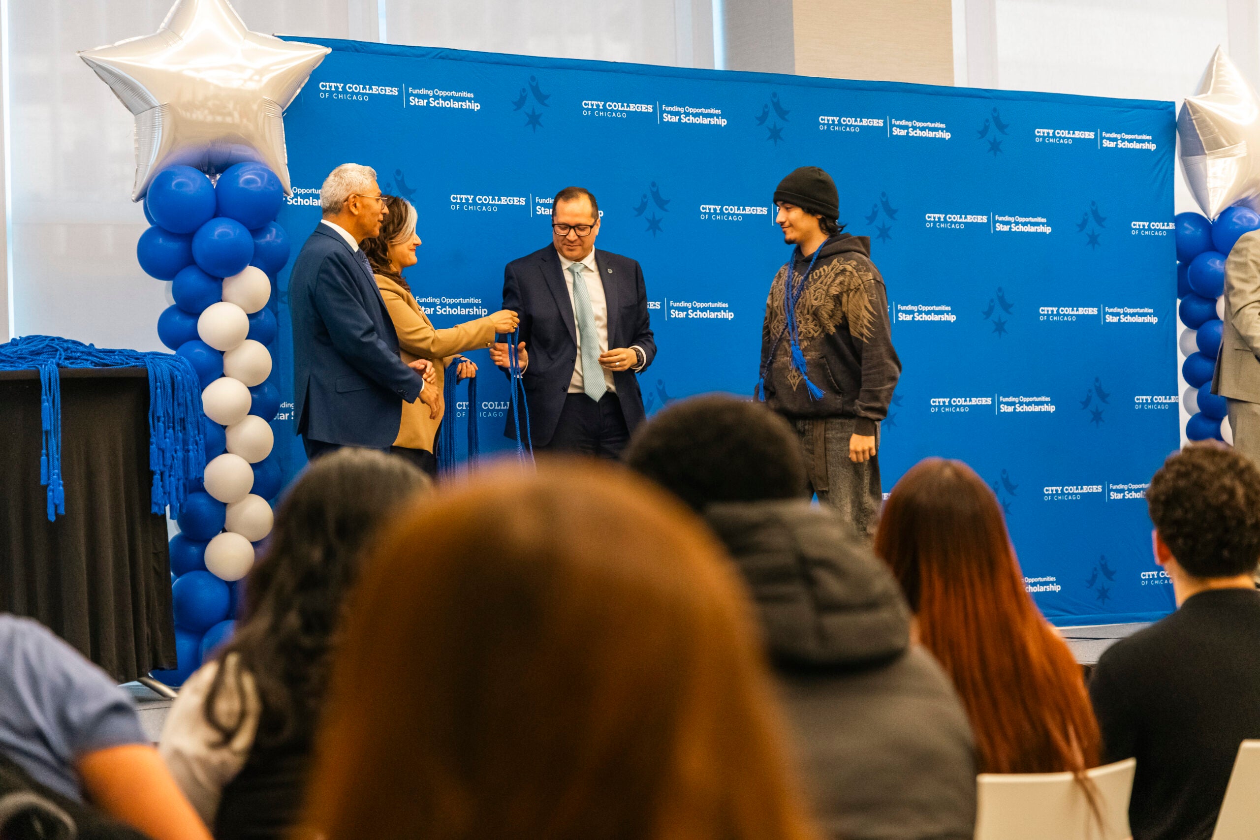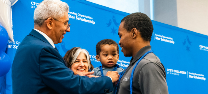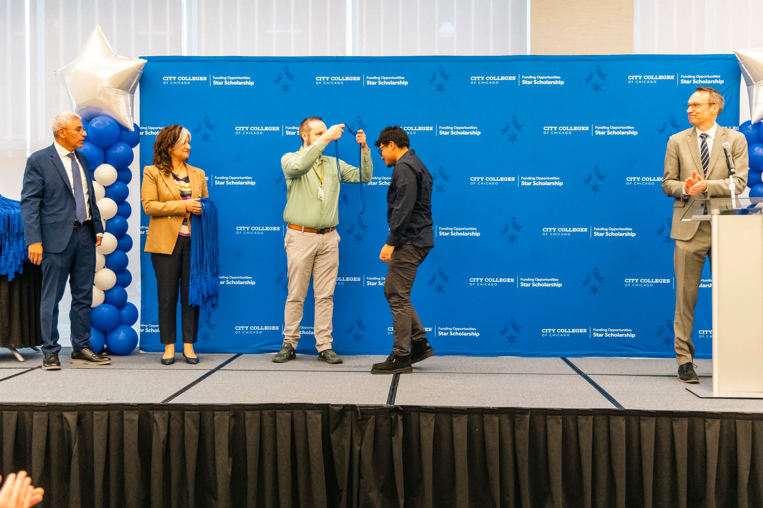 During the Star Scholar Cording Ceremony, City Colleges leadership presented the royal blue cords that the Star Scholars will wear to the City Colleges Commencement ceremony on May 2, 2026 at Wintrust Arena. More than two hundred Star Scholars will be in attendance at the cording ceremony along with their families and friends, City Colleges of Chicago leaders, faculty and staff.
